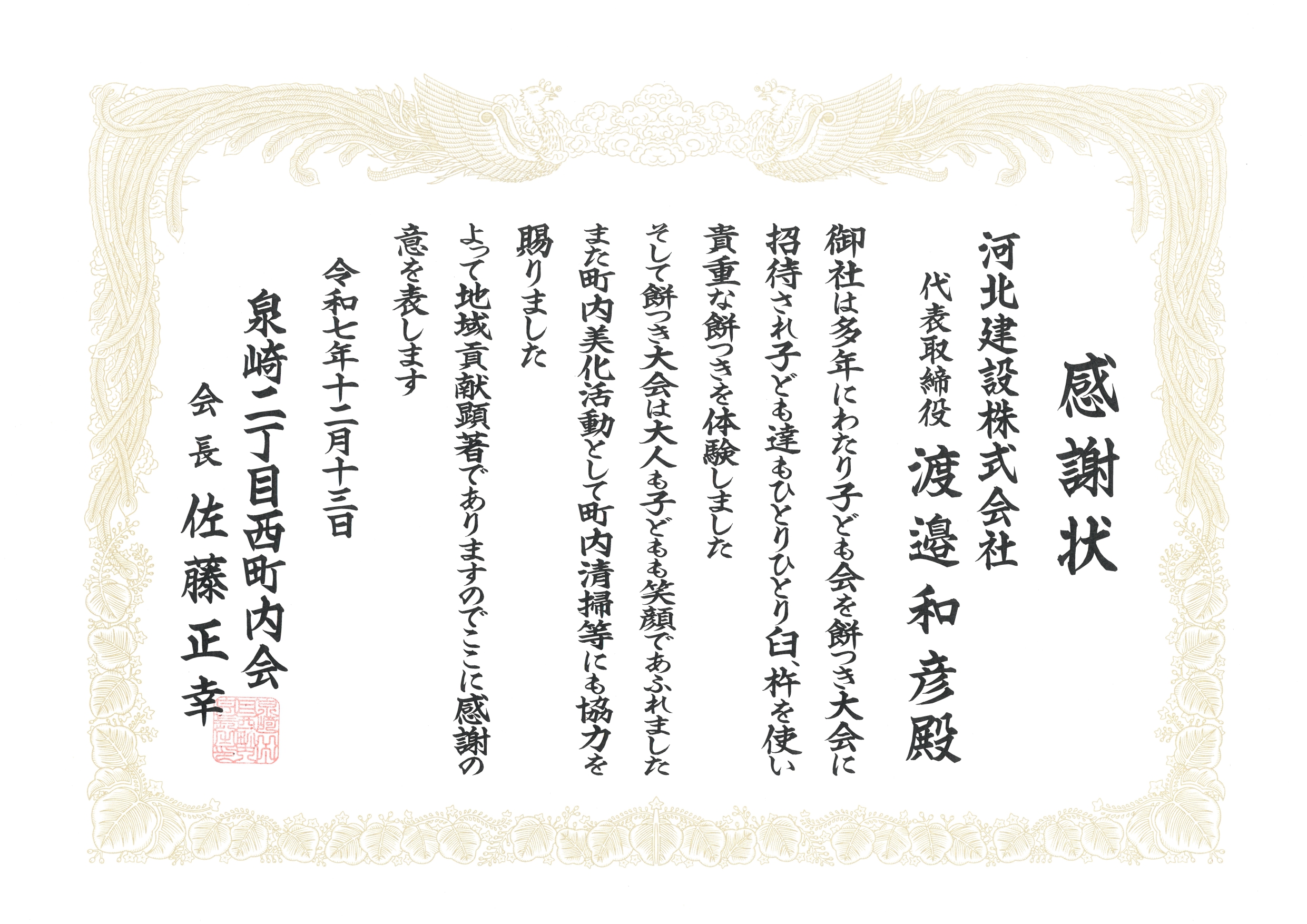 開催に伴い、泉崎二丁目西町内会様、あすか子供会様より、感謝状をいただきました。