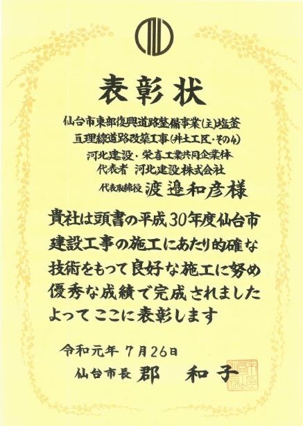 このたび当社施工の『塩釜亘理線道路改築工事(井土工区・その4)』が仙台市より優良建設工事を受賞しました。